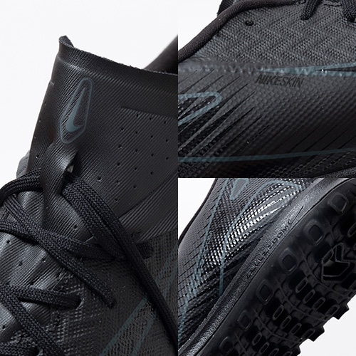 ●アッパーには、柔らかく柔軟性に優れたメッシュ素材に薄いコーティングを施したNikeSkinを使用。 素足でサッカーをしているような感覚で、ボールをコントロールできます。