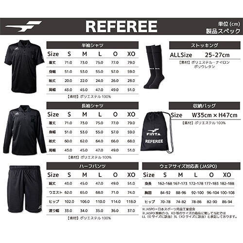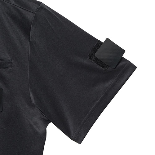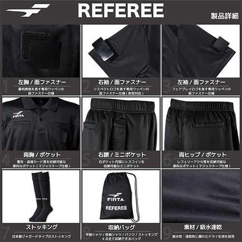 シャツは審判資格、リスペクトロゴ、フェアプレイロゴを表す専用ワッペンの面ファスナー仕様。両胸には警告・退場カード等を収納可能な便利なマジックテープ仕様のポケット。吸水性・速乾性に優れたドライ生地を採用。