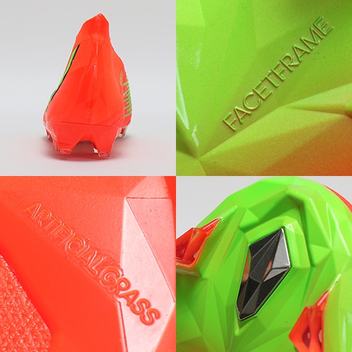 ●スプリットアウトソール前足部の重みのあるPower Facet(パワーファセット)が前足部への重量比率を高め、力のあるキックにも貢献する。人工芝とのひっかかり軽減し適度なグリップを提供し安定したプレーが可能。