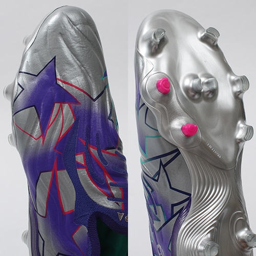●インサイド、アウトサイドに配置されたTOUCHPODS(タッチポッド)がボールの勢いを吸収し、足に吸い付くような安定感と、研ぎ澄まされた感覚でボールを扱うことを実現。