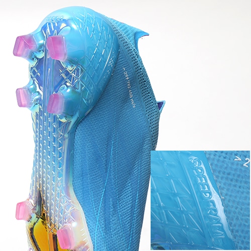 ●軽量性に優れながらも、前への推進力を加速させるCARBITEXカーボンプレートを採用したSPEEDFRAME(スピードフレーム)アウトソール。エッジを効かせたスタッド形状にすることで、より強い蹴りだしをサポート。