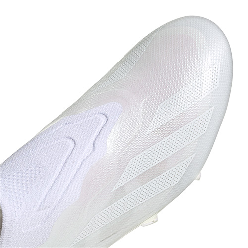 ●半透明の「Aeropacity Speedskin(エアロペーシティ スピードスキン)」アッパー採用。シングルレイヤーのモノメッシュを、2層のTPUフィルムで覆うことで、素足感覚とスパイクの軽量性が向上。適応力に優れるアディダスPRIMEKNITの履き口と圧縮したシューレスレスの前足部が第二の肌のようなフィット感をもたらす。足元をしっかりと固定する。