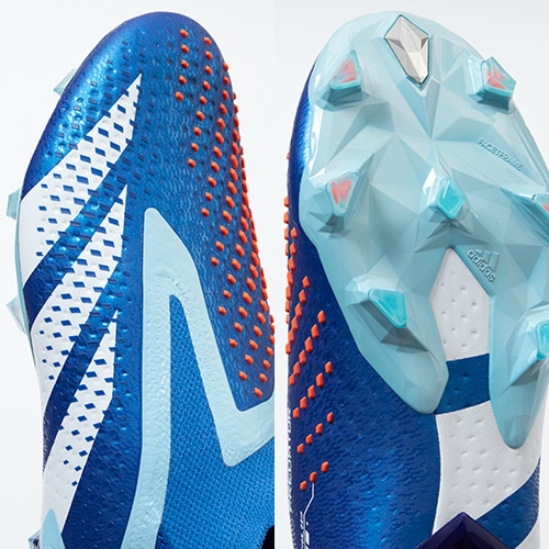 ●スプリットツーリングをベースにダイヤモンドのようなカッティングを施したスタッドを採用したアウトソールが、様々な角度への動きをサポート。「パワーファセット」を加えることで、前足部への重量比率を高め、力のあるキックにも貢献する。