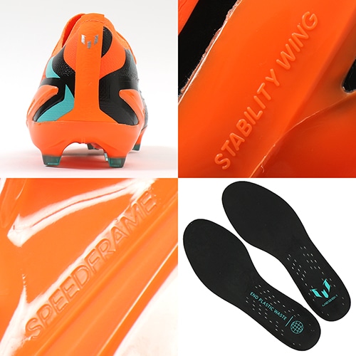●バイオベースのポリアミドでできた高反発の軽量素材で、軽量化と前足部の屈曲性を実現することで、プレーヤーの爆発的な推進力と加速度をサポートする「エアロプレート」。強い蹴りだしと推進力で、主に局面を制する『ゼロイチスピード』をサポート。