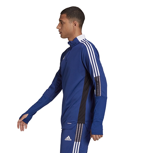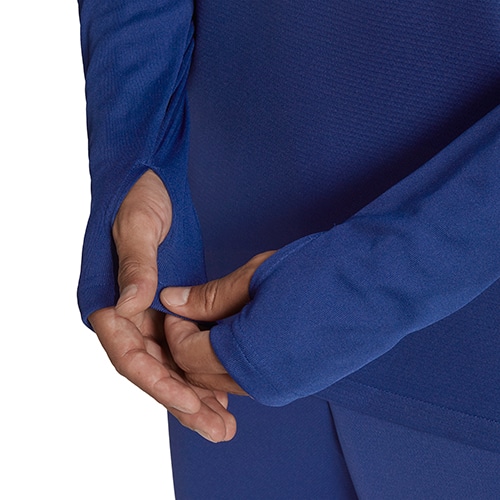 寒さを吹き飛ばす冬仕様のフリース素材を使用。袖口にはサムホールを備え、手の甲まで暖かく保つ。吸湿性に優れたAEROREADYファブリックが爽やかな着心地をキープ。運動して身体が暑くなってきたらクォータージップを開けて汗を素早く発散することができる。