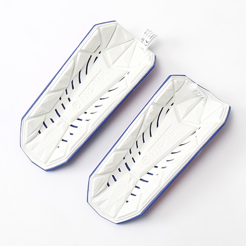 パーフォレーションを施した成型EVA裏張りをセットし、快適なクッション性と衝撃吸収性能を高める。コンプレッションスリーブがシンガードをしっかり固定する。