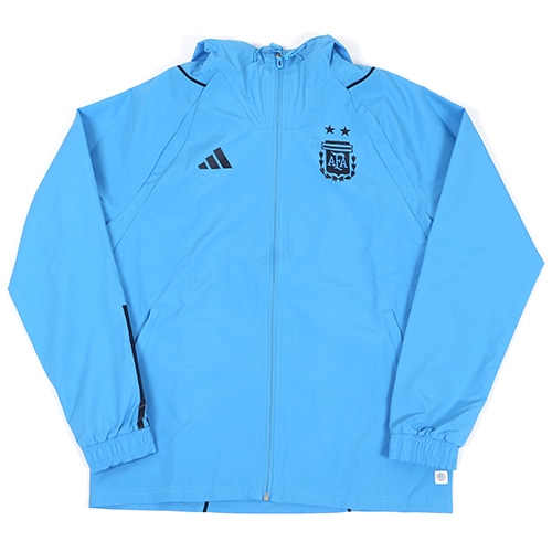 アルゼンチン代表の2022年モデルオールウェザージャケット。伸縮性のある袖口、調節可能なフード、そして撥水生地により、悪天候に対抗する。メッシュライニングは快適な着心地をもたらす。