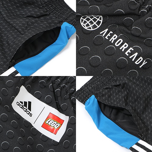 全体にLEGOブロックのモチーフと、LEGOのミニフィギュアヘッドのバッジをあしらっている。デザインのベースは、試合とトレーニングセッションの合い間にプロ選手たちが着用するショーツ。吸湿性に優れたAEROREADY機能を採用し、試合でギアをアップするときも快適なはき心地を持続する。レギュラーフィット。サイドシームにジップポケット付き。