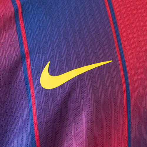 伝統と未来。伝統的なバルサのストライプが、バルサのサッカーにとって不可欠な要素、リズムとエネルギーをもたらす新たなグラデーションと共に再考された。ストライプを斜めに横切るパープルの配色が生まれ、パーツに躍動感と加速感を与えている。