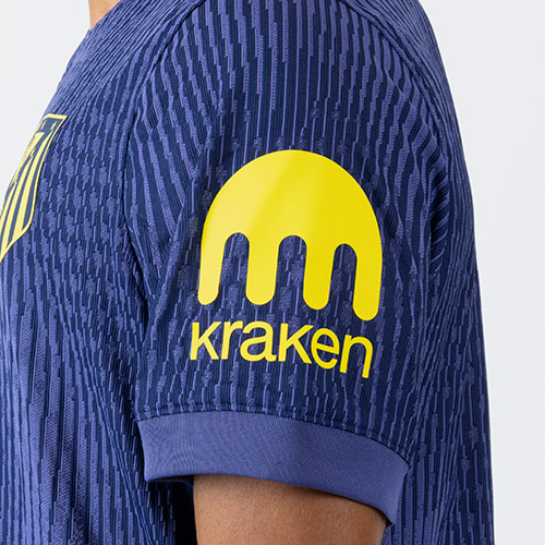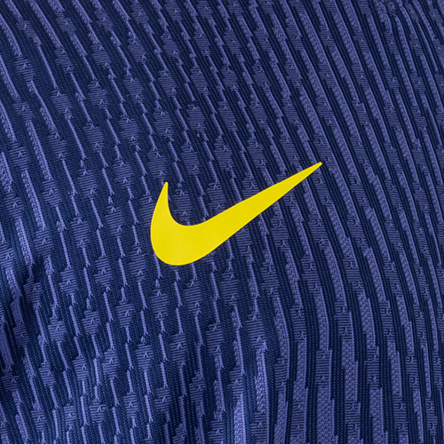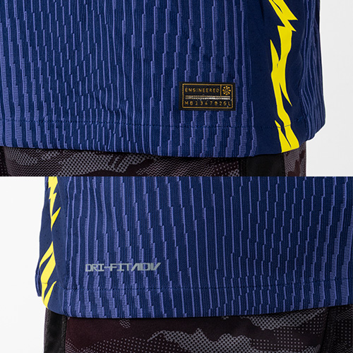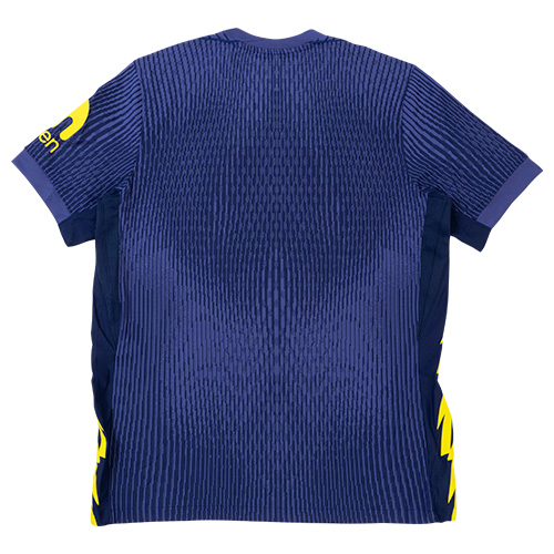ネイビーブルーを基調としたデザインで、背面には印象的な稲妻があしらわれています。モノクロの紋章、ナイキのスウッシュ、スポンサーなどの他の部分にも使われている鮮やかな黄色が、エネルギッシュで独特なタッチを与えています。リヤド・エア・メトロポリタンでの各試合の直前に流れるサウンドトラックから直接インスピレーションを得ています。関連商品