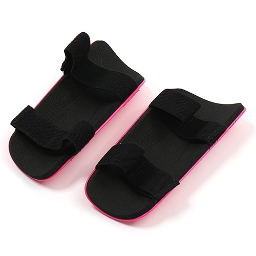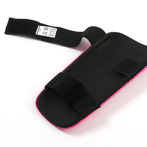 EVAの裏張りを施した硬いシールドが衝撃を吸収し、軽快な動きを妨げない。2本の面ファスナーストラップ付きだから、フルスピードで動いてもズレにくい。