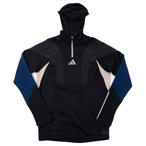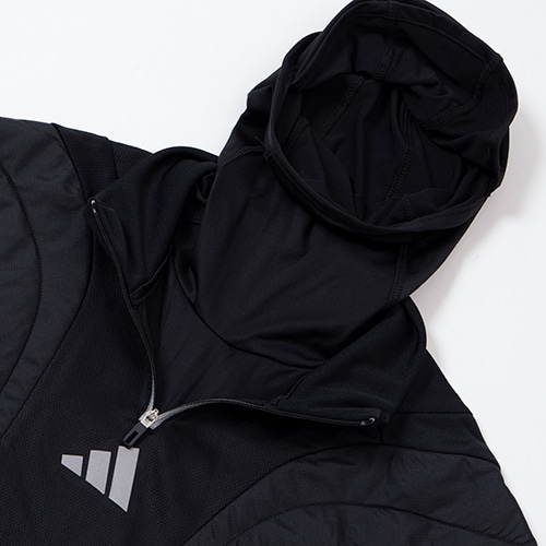胸に入れた中わたが保温性を保ち、サイドのメッシュパネルがエアフローを促す。サッカーのトレーニング中、適切な体温維持に貢献する一着。ウェア内に収納可能なバラクラバを使えば、顔と首を冷気から保護できる。寒さが顔を覆うほどでもないときは、首まで下ろしてスヌードにしたり、必要なくなったら完全にしまうこともできる便利な仕様。吸湿性に優れたAEROREADY素材が、爽快な着心地をキープする。