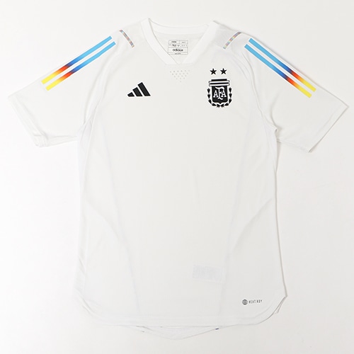- アルゼンチン代表の2022年モデル、プレマッチシャツ。リサイクル素材で作られた、清涼感のあるアルゼンチン代表ウォームアップジャージー。無駄を省いたスリムなシルエットのシャツには、厳しい暑さのなかでもゲームを有利に運ぶのを助ける、清涼感をもたらすHEAT. RDYテクノロジーを採用。