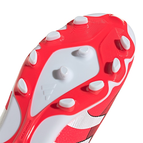 ●様々なグラウンドでの使用を想定して開発された、汎用性の高い楕円形スタッドのマルチグラウンドアウトソール。硬さのあるピッチでの衝撃拡散の向上と最適な回転動作をサポート。