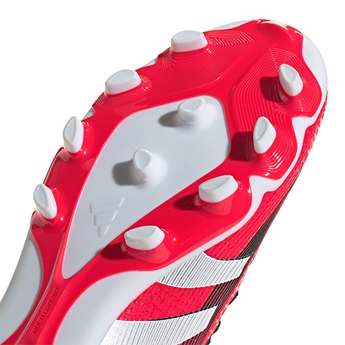●様々なグラウンドでの使用を想定して開発された、汎用性の高い楕円形スタッドのマルチグラウンドアウトソール。硬さのあるピッチでの衝撃拡散の向上と最適な回転動作をサポート。