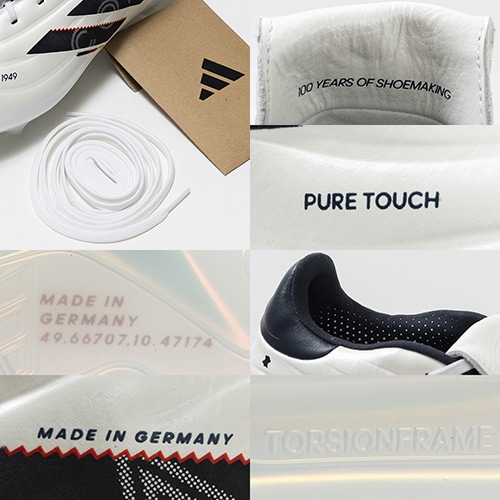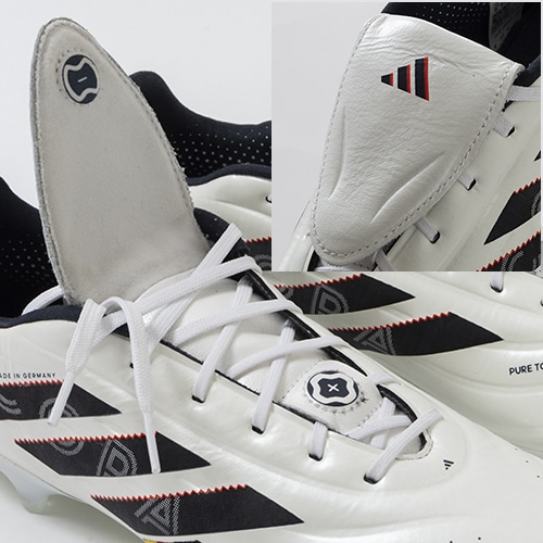 ●ボールコントロールスペースの拡大を実現するマグネットクロージャー付きフォールディングタン。アウトサイドとソール部分には、品質の証として"Made in Germany"の文字が刻まれている。