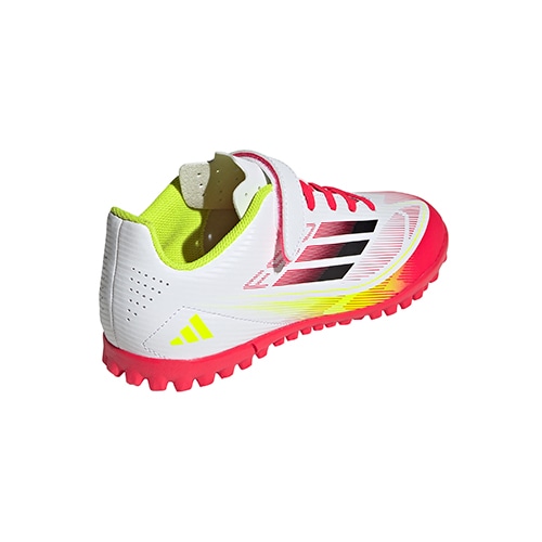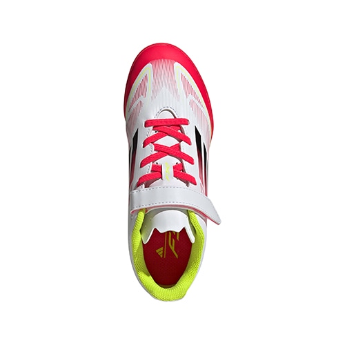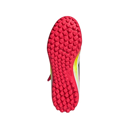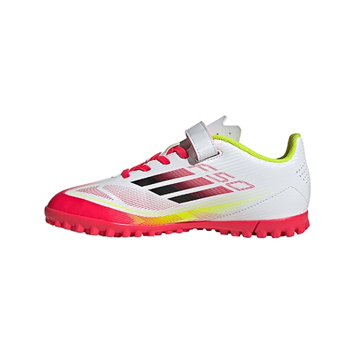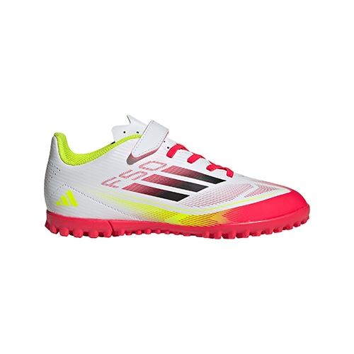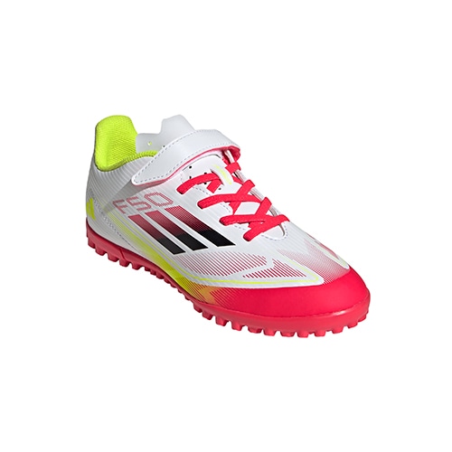 軽量素材とテクノロジーを駆使し、現代のゲームスピードに適応するように再設計されたadidas『F50』のTF(ターフコート)対応ジュニア用トレーニングシューズのHook&Loop(ベルクロ)タイプ。
