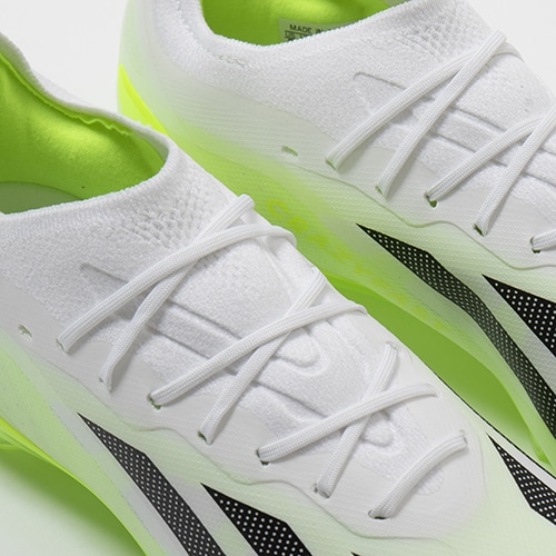 ●半透明の「Aeropacity Speedskin(エアロペーシティ スピードスキン)」アッパー採用。シングルレイヤーのモノメッシュを、2層のTPUフィルムで覆うことで、素足感覚とスパイクの軽量性が向上。足元をしっかりとホールドするアディダスPRIMEKNITの履き口。