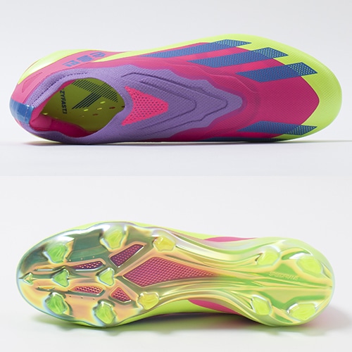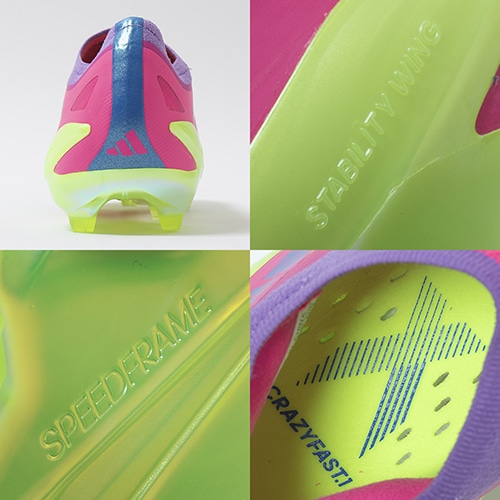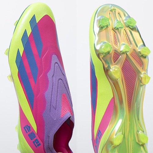 ●半透明の「Aeropacity Speedskin(エアロペーシティ スピードスキン)」アッパー採用。シングルレイヤーのモノメッシュを、2層のTPUフィルムで覆うことで、素足感覚とスパイクの軽量性が向上。適応力に優れるアディダスPRIMEKNITの履き口と圧縮したシューレスレスの前足部が第二の肌のようなフィット感をもたらす。足元をしっかりと固定する。