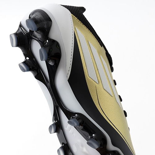 ●様々なグラウンドでの使用を想定して開発された、汎用性の高い楕円形スタッドのマルチグラウンドアウトソール。硬さのあるピッチでの衝撃拡散の向上と最適な回転動作をサポート。