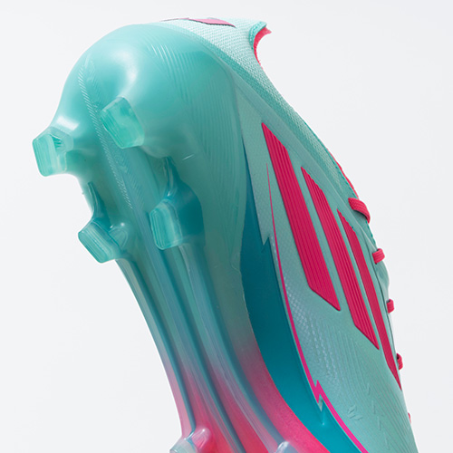 ●爆発的な推進力と効率的に素早くパワー伝達するために設計された「スプリントフレーム360」アウトソール。追加の前足スタッドとジェネレーティブスタッドデザインは、乾いた天然芝でのトラクションを最適化。さらに一体型のエクスターナルヒールカウンターを採用し、あらゆる方向への加速とスピードに貢献。