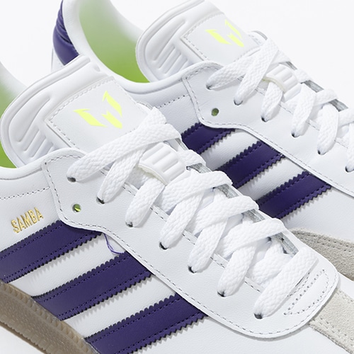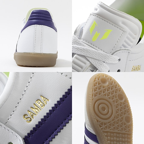 凍った地面でのサッカートレーニング用に1950年代に開発された「SAMBA(サンバ)」の「MESSI」モデル。シュータンにはリオネル・メッシ(MESSI)のシグネチャーロゴをデザイン。何十年にもわたりインドアサッカーを支配してきた、ストリートでも愛用できるクラシックなサッカーシューズ。