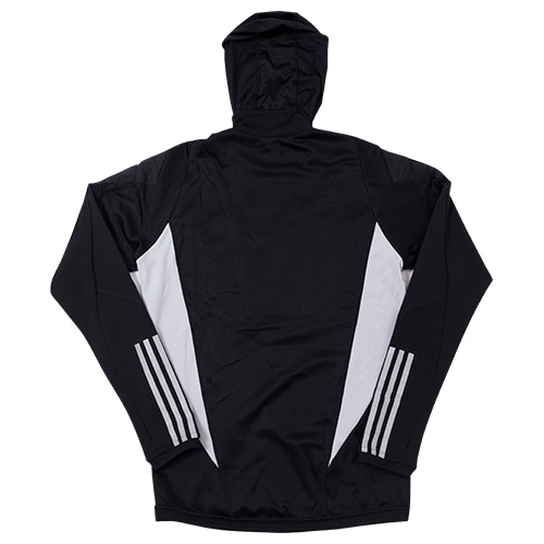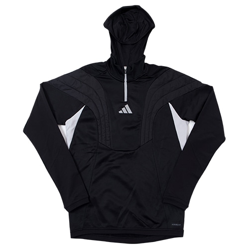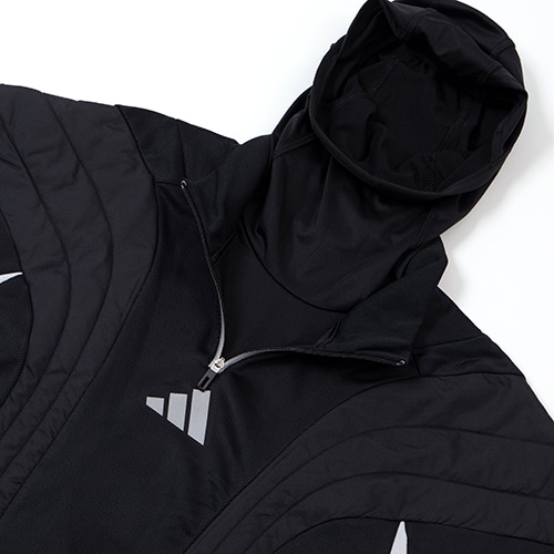 胸に入れた中わたが保温性を保ち、サイドのメッシュパネルがエアフローを促す。サッカーのトレーニング中、適切な体温維持に貢献する一着。ウェア内に収納可能なバラクラバを使えば、顔と首を冷気から保護できる。寒さが顔を覆うほどでもないときは、首まで下ろしてスヌードにしたり、必要なくなったら完全にしまうこともできる便利な仕様。吸湿性に優れたAEROREADY素材が、爽快な着心地をキープする。