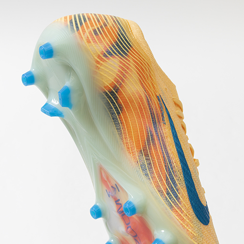 ●人工芝で多方向へのトラクションを発揮する円柱スタッドとヒールのスタッズを組み合わせ、波のようなトラクションパターンを形成。3/4レングスのAir Zoomユニットとの接触面積を拡大するとともに、最適なグリップ性も実現しています。