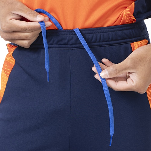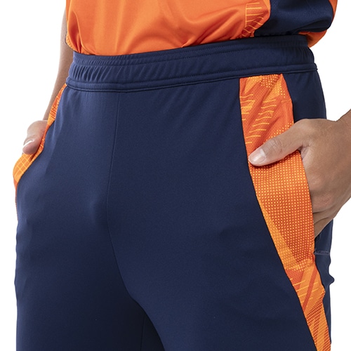 現代の宇宙服からインスピレーションを得た、ビビッドなオレンジ色のディテールのトレーニングパンツ。