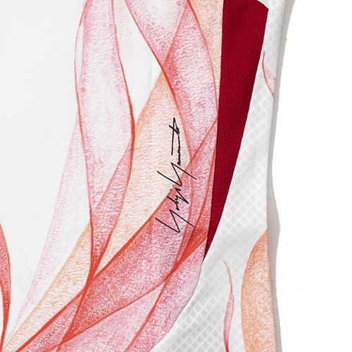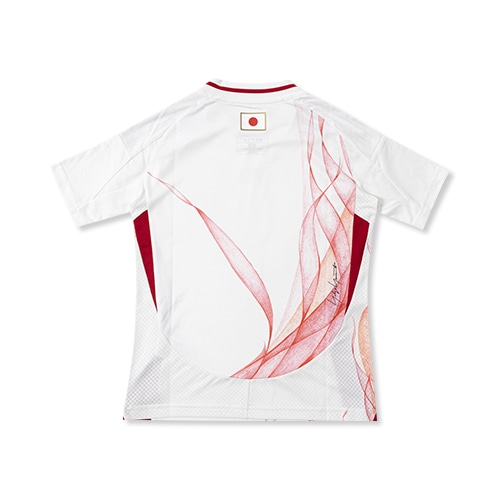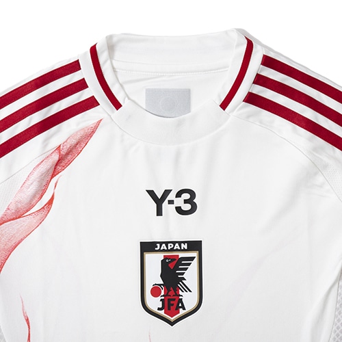 日本代表のダイナミックなプレーと、サポーターの熱き情熱を象徴するかのような、うねりを上げて燃え上がる炎の手描きグラフィックと、Y-3 ロゴ、サッカー日本代表エンブレムが映えるデザイン。