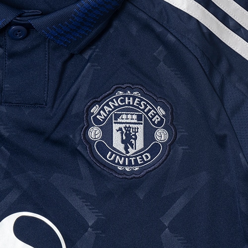 シルバーのディテールがくっきりと浮き上がるインディゴブルーの地を、Mのさりげないモノグラムパターンが埋め尽くす。スタイリッシュなポロ襟のライトブルーのグラフィックは、オールド・トラッフォードの近くを流れる川がモチーフになっている。
