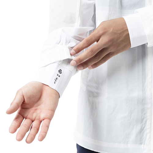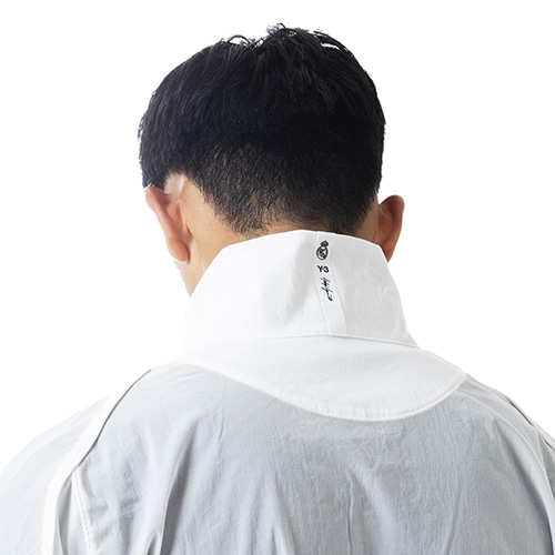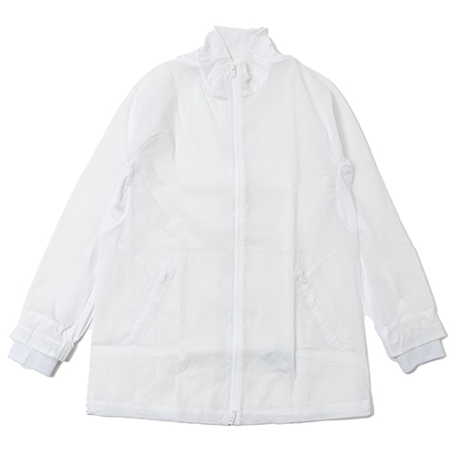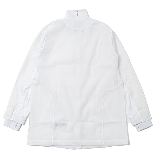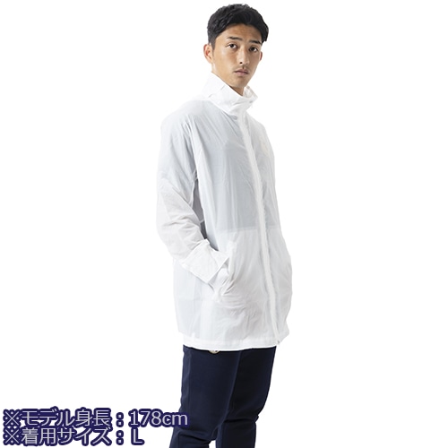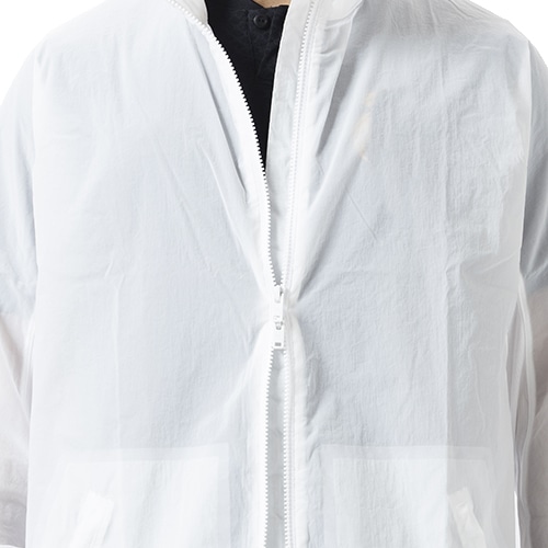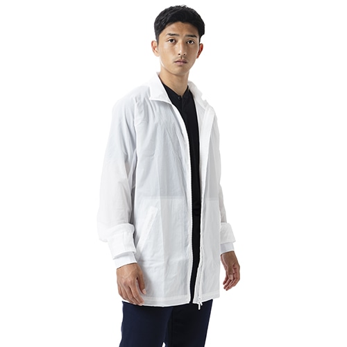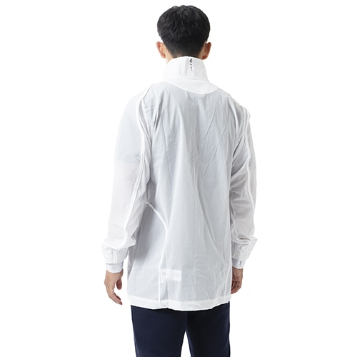 透け感のある白いナイロン生地がわずかにストレッチ性を発揮し、伸縮性の袖口と調節可能な裾を備えた身体にフィットする作り。襟にメッシュの裏地を配して、通気性や可動性を考慮している。2ウェイジッパーがスタイリッシュさと汎用性を高めている。
