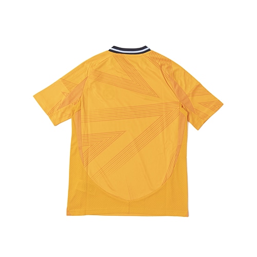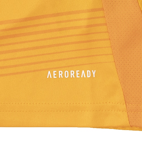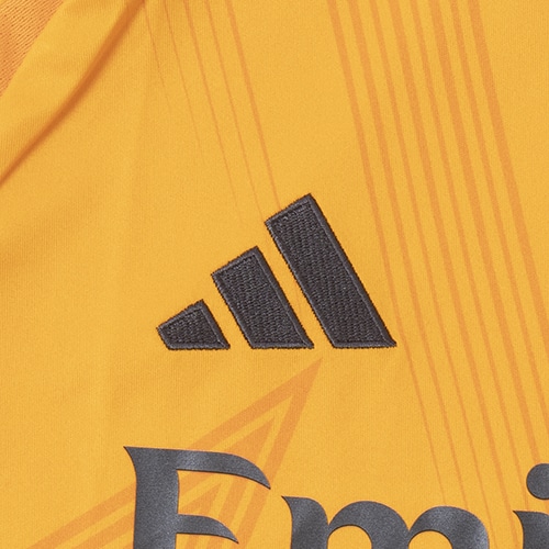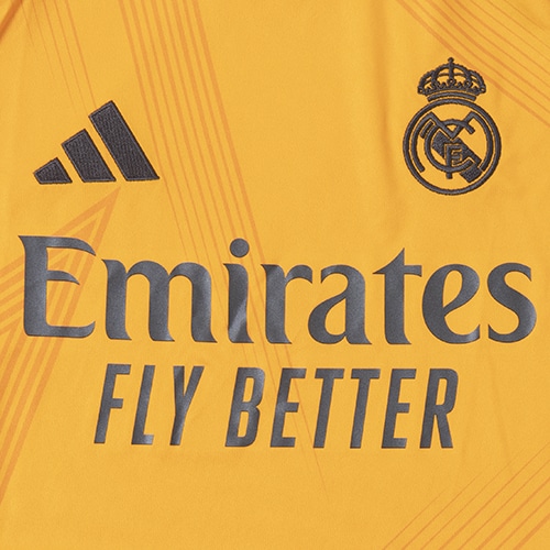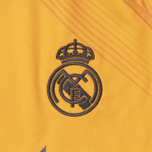 新たな世代の台頭を象徴するデザイン。鮮やかなオレンジ色の地に、星をヒントにした抽象的な柄が映える、レアル・マドリードの選手の星のように輝かしいスキルを讃えて作られたアウェイユニフォーム。