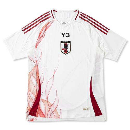 日本代表のダイナミックなプレーと、サポーターの熱き情熱を象徴するかのような、うねりを上げて燃え上がる炎の手描きグラフィックと、Y-3 ロゴ、サッカー日本代表エンブレムが映えるデザイン。