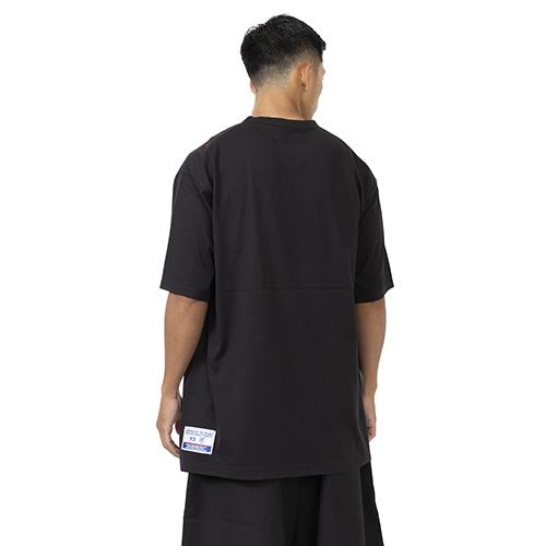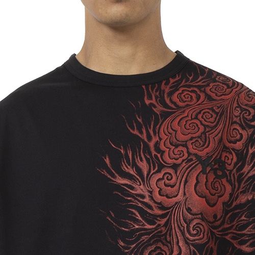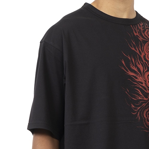 サッカーとファッションという二つのカルチャーを表現した半袖Tシャツ。とびきりソフトなコットンニットの胸と肩に、ピッチで着用されるシャツからインスピレーションを得た炎のグラフィックをあしらっている。