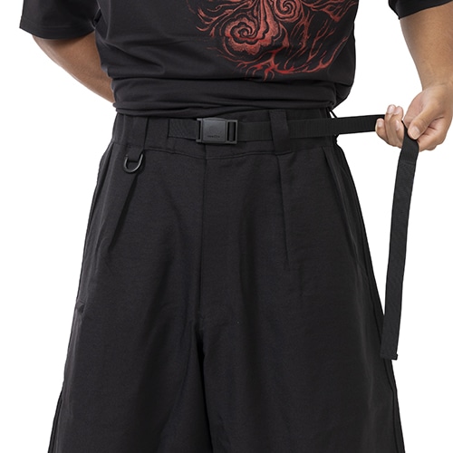 サッカーとファッションという二つのカルチャーの融合。エネルギー漲る美しきサッカーのゲームをセレブレート。ウエストを自在に調節できるウエストバンドから、たっぷりとったウーブンポリエステルの布地が腰回りをゆったり覆う、ゆとりを持たせたデザイン。Y-3の美意識をクリアに示すウーブンロゴが、アクセントになっている。