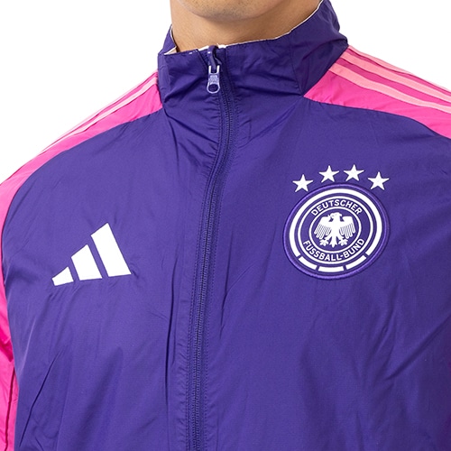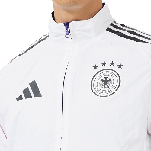ドイツ代表のプライドを掲げる、アディダス ジャケット。チームのホームでもアウェイに遠征するときにも着られる、選手が着用するキットと同じデザインを身に纏える、リバーシブルのフルジップデザイン。