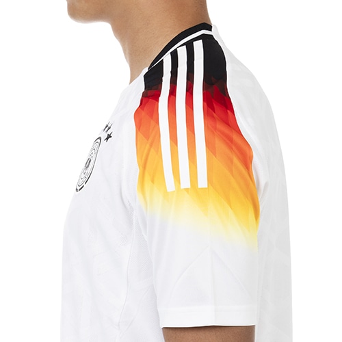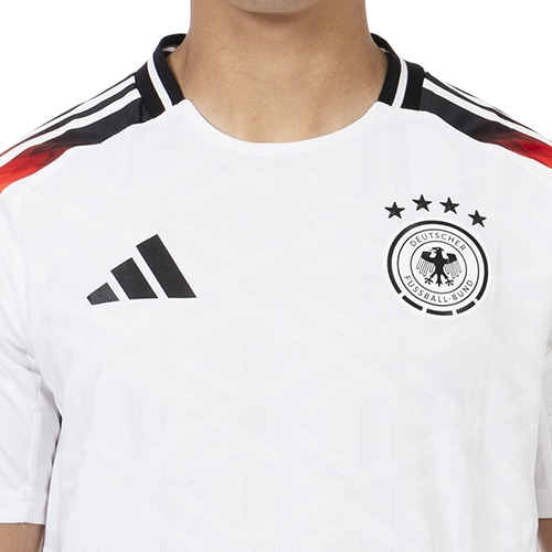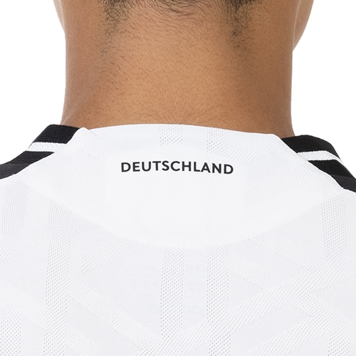 ドイツサッカーのスピリットをカタチにして、4度の世界チャンピオンのシンボルをすべて詰め込み、肩に鷲の羽根をイメージした装飾を、フロント全体にはDFBロゴからとったエンボス加工のディテールをそれぞれあしらったデザインし、ソフトで通気性に優れたファブリックに、スタジアムでもピッチでもドライな感触を保つ、HEAT. RDYテクノロジーを使用。