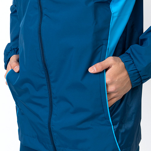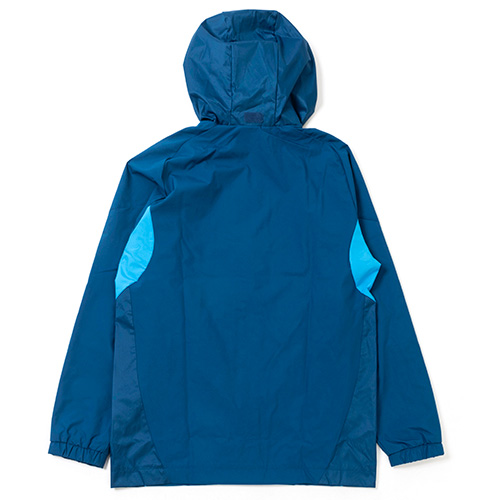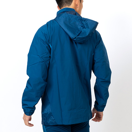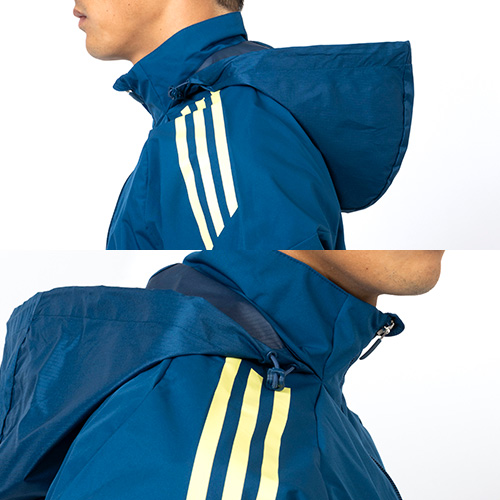 ソフトな肌触りのプレーンウィーブファブリックを使用し、トレーニングが終わるまで、選手の身体を風雨から保護する。小雨のときに雨除けとなるフードは、不要なときには畳んで収納できるパッカブル仕様。