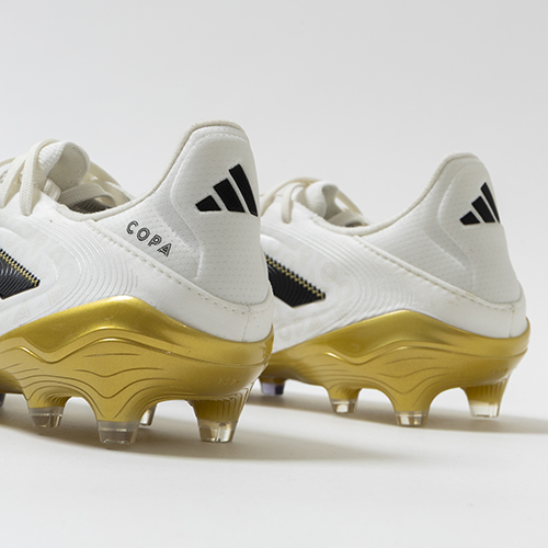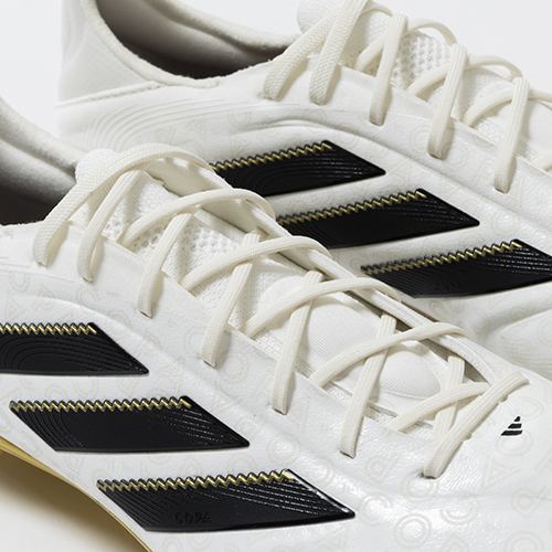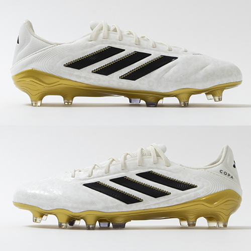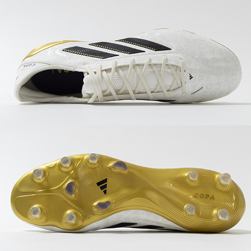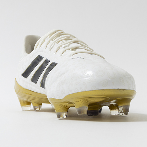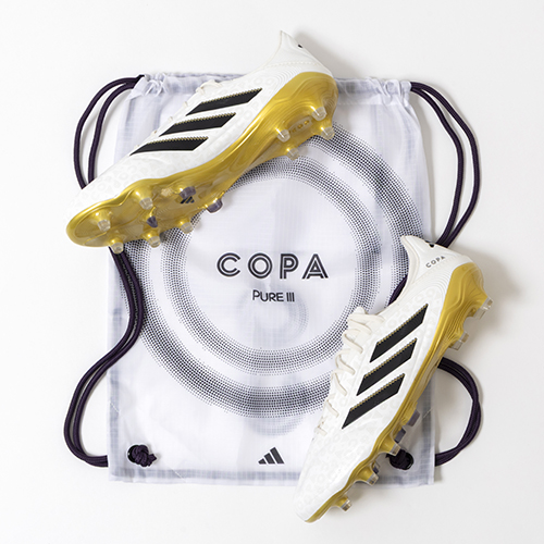アディダスの象徴的なホワイトとブラックを基調に、シーズンの王者が獲得するトロフィーに敬意を表し、 ゴールドカラーを採用した「ROAD TO GLORY(ロード トゥー グローリー)PACK」が登場。これまで以上に精度の高いコントロールを可能にする。ゲームを自在に操る支配者に捧げる、繊細なボールタッチと比類なき履き心地を追求した設計の「COPA PURE(コパピュア) 3」のELITE(エリート)モデルFG(ファームグラウンド)対応スパイク。