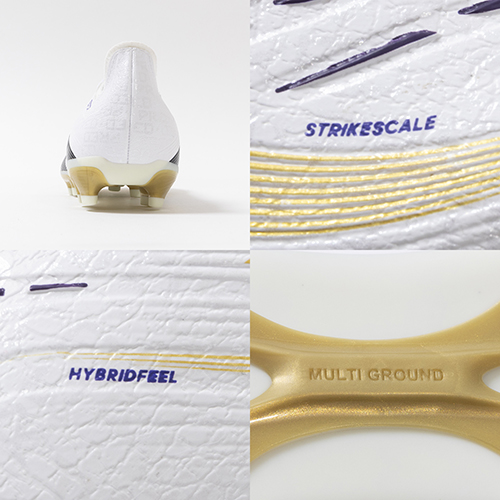 ●表面全体が凹凸のある形状になっているハイブリッドフィールアッパーは、グリップの効いたストライクスケールフィンを備えて、シュートを打つ際に正確なボールコントロールを可能にする。