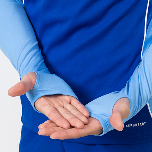スタンドカラーまでジップを閉めて、袖口のサムホールを指にかければ、首元から手の甲まで暖かくカバーできる。さらに、汗蒸れの心配も無用。AEROREADYが汗を素早く吸収するから、爽やかな肌触りが続く。