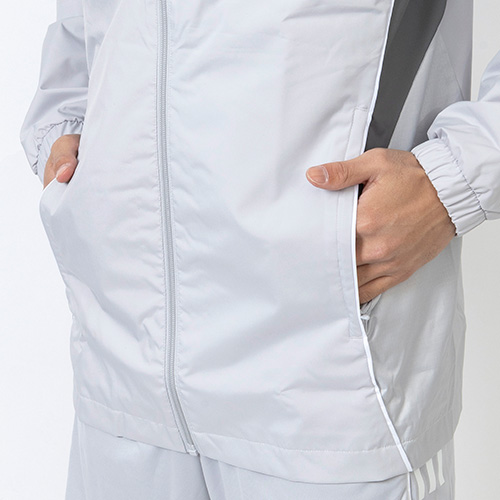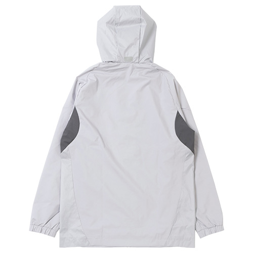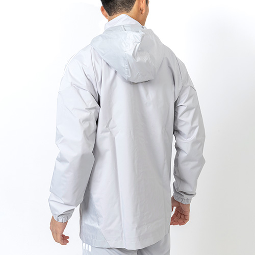 ソフトな肌触りのプレーンウィーブファブリックを使用し、トレーニングが終わるまで、選手の身体を風雨から保護する。小雨のときに雨除けとなるフードは、不要なときには畳んで収納できるパッカブル仕様。