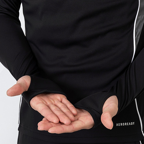 スタンドカラーまでジップを閉めて、袖口のサムホールを指にかければ、首元から手の甲まで暖かくカバーできる。さらに、汗蒸れの心配も無用。AEROREADYが汗を素早く吸収するから、爽やかな肌触りが続く。