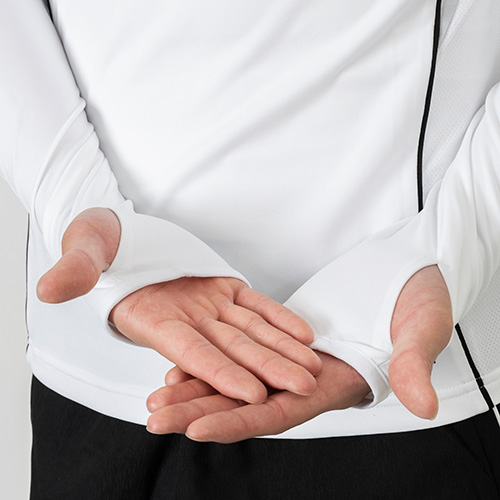スタンドカラーまでジップを閉めて、袖口のサムホールを指にかければ、首元から手の甲まで暖かくカバーできる。さらに、汗蒸れの心配も無用。AEROREADYが汗を素早く吸収するから、爽やかな肌触りが続く。