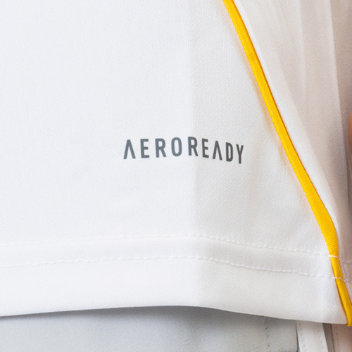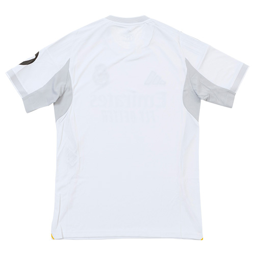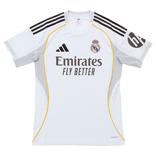 チームの礎。ベルナベウスタジアムの改築工事を記念する、レアル・マドリードのホームユニフォーム。数々の栄光を築いてきた過去のユニフォームへのオマージュを込めて、それらの配色、風合い、シェイプを採用している。25-26シーズンに伝説的ホームスタジアムで選手が着用するためにデザインされたこのユニフォームには、選手の身体を快適にサポートする、優れた吸湿性を発揮するAEROREADYを使用。クラブのプライドを示す刺しゅうエンブレム入り。