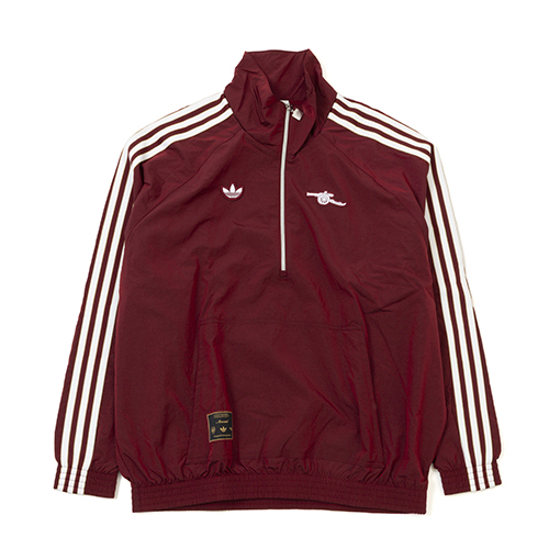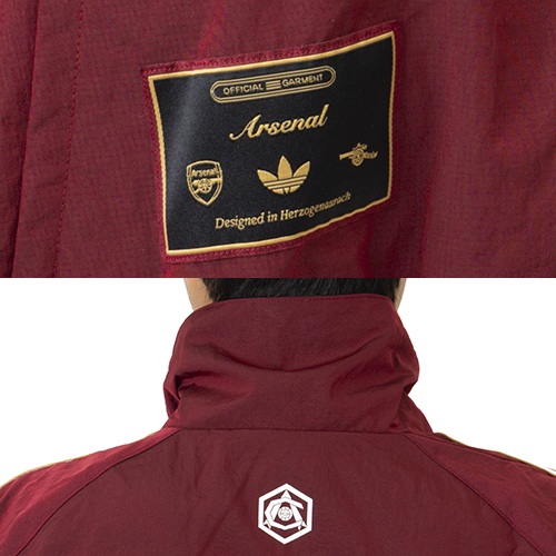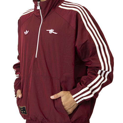 1980年代のサッカー文化を体現した、adidasのアーセナルジャケット。特徴的なハーフジップの両側に配されたトレフォイルロゴと大砲のエンブレムのディテールが、レトロなルックを演出します。