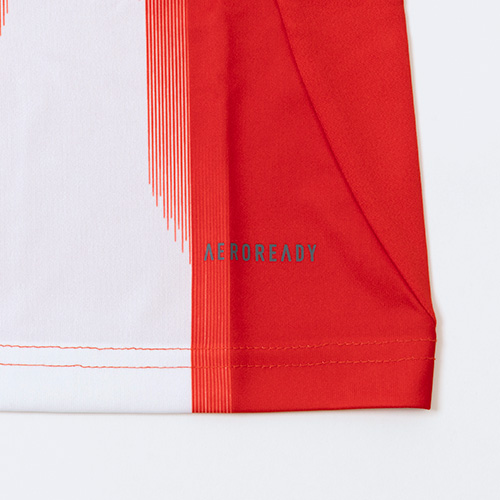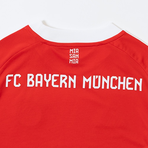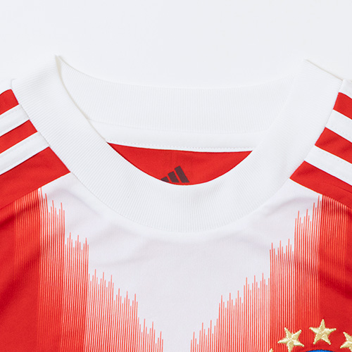 バイエルンのホームを讃える、彼らが思い描く姿を再確認してデザインしたユニフォーム。近づいてよく見ると、クラブを象徴する赤と白の配色で大きな"M"の文字が描かれているのがわかる。ホームであるミュンヘンを表すこの文字が、グリッチがかかったようなデザインに隠れている。ファンに快適さと誇りをもたらすように作られた、クラブの刺しゅうエンブレムが入った、優れた吸湿性を発揮するAEROREADYテクノロジーを採用したシャツ。