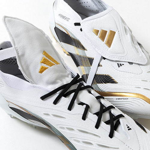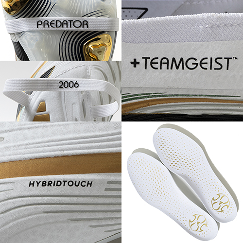 アディダスの伝説的プロダクトをセレブレートする限定スパイクが登場。カーブをつけたラインや、2006年のチームガイストボールのブラック、ホワイト、ゴールドの配色、ヒールにあしらった+Teamgeistのロゴがアクセントの『PREDATOR(プレデター)』FT(フォールディングタン)タイプのELITE(エリート)モデルFG(ファームグラウンド)対応スパイク。