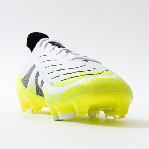 ●表面全体が凹凸のある形状になっているハイブリッドフィールアッパーは、グリップの効いたストライクスケールフィンを備えて、シュートを打つ際に正確なボールコントロールを可能にする。